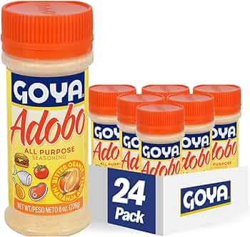 Goya Adobo Seasoning is a pre-mixed dry spice blend (1.7 oz/48g container) featuring salt, garlic, onion, paprika, black pepper, sugar, and spices. Developed for authentic Filipino adobo dishes, it simplifies seasoning meat with 1-2 tablespoons per pound