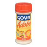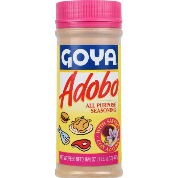 Goya Adobo Seasoning is a pre-mixed dry spice blend (1.7 oz/48g container) featuring salt, garlic, onion, paprika, black pepper, sugar, and spices. Developed for authentic Filipino adobo dishes, it simplifies seasoning meat with 1-2 tablespoons per pound